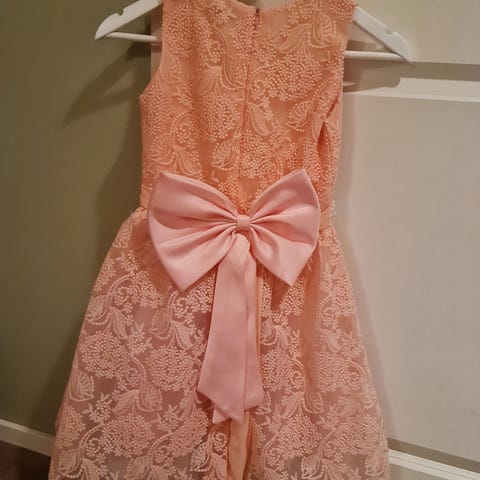 Primark barnekjole for jente i størrelse 128. Kjolen er rosa og laget av polyester. Den har lange ermer og et design med volanger og dekorative detaljer på skjørtet.