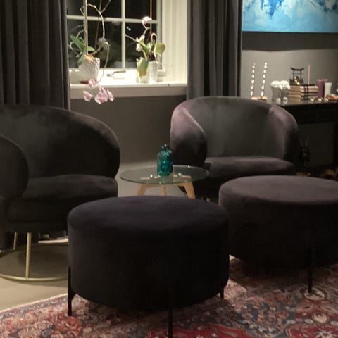 Olivengrønn puff i velour med gullramme selges. Pent brukt i hjem uten kjæledyr eller røyk.