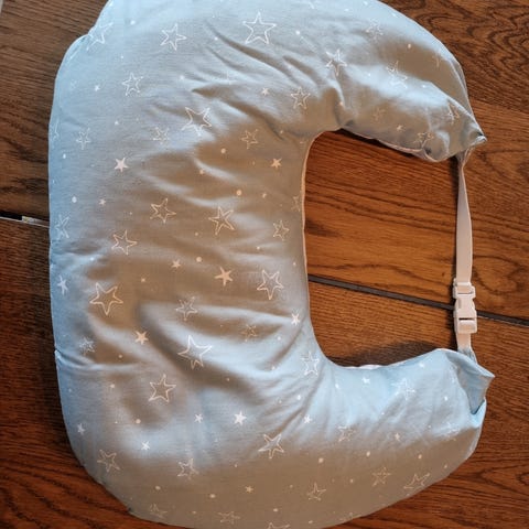 IKEA ammepute med dyremønster, designet for støtte og komfort under amming. Putens form er tilpasset for å gi god støtte til både mor og barn.