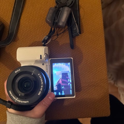 Sony NEX-5T med linse med uv-filter påmontert, blitz, adapter til blitzsko.