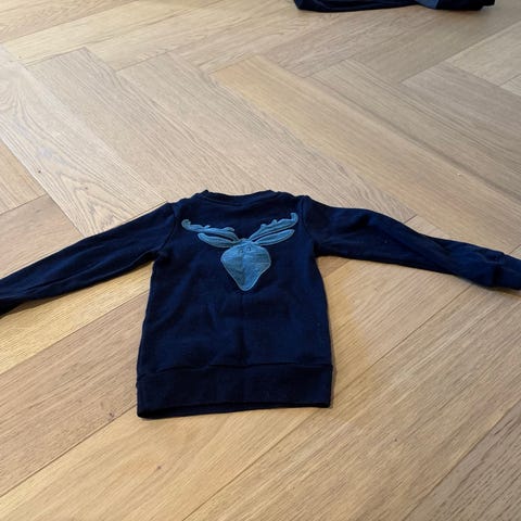 WoolLand Bergen genser og buske i størrelse 92/96, laget av merinoull. Passer for både gutter og jenter. Fargen er grå med mørkere detaljer på albuer og lommer. Materialet gir varme og komfort.