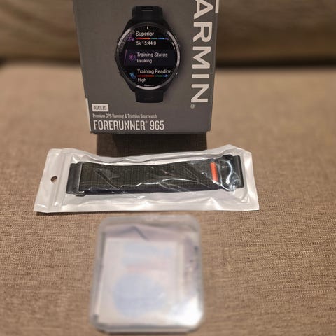 Garmin Forerunner 965 smartklokke med gul rem. Klokken har en rund skjerm og er designet for å gi informasjon om tid, aktivitet og helse. Egnet for bruk under trening og daglig aktivitet.