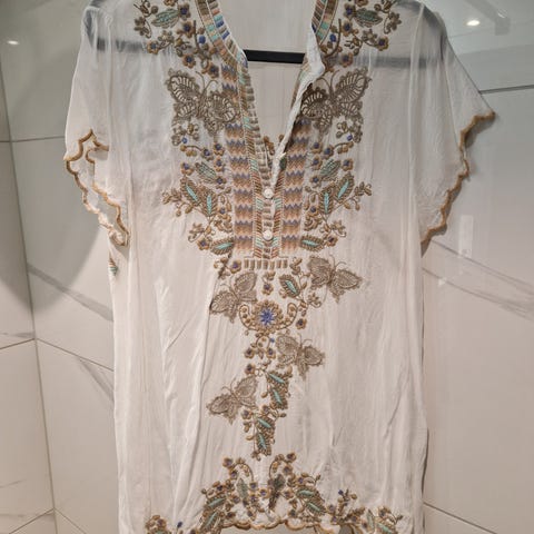 Nydelig lin bluse med flotte broderier - romslig model. Bredden er 79 cm og lengden er 81 cm. Veldig behagelig å ha på...