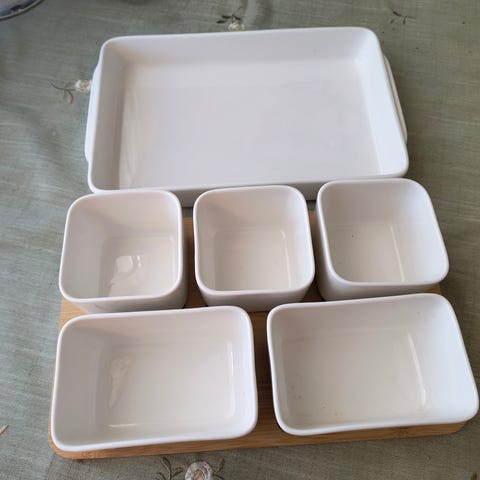 «Porselensett med seks skåler og stor form på trebrett. Tåler mikro, ovn, fryser og oppvaskmaskin.