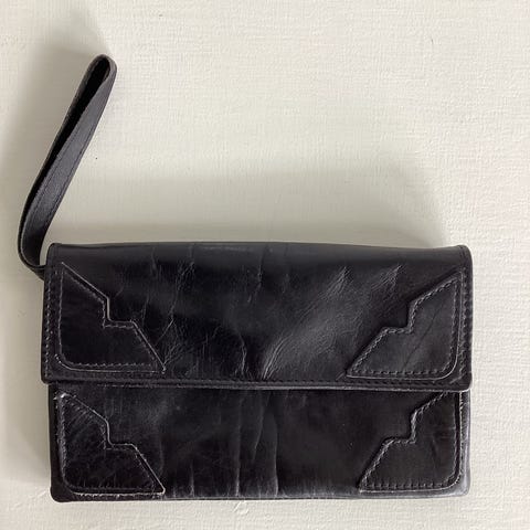 Liten konvolutt-veske ,i cognac-farget semsket skinn selges. Fra Søgne, ikke brukt..19•15cm, md liten lomme md glidelås. Magnet-lås i « lokket».