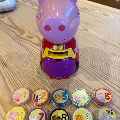Peppa Gris læringsspill med magnetiske brikker og tavle. Produktet inneholder tall, figurer og symboler for pedagogisk lek. Egnet for barn og fremmer tidlig læring av tall og telling.