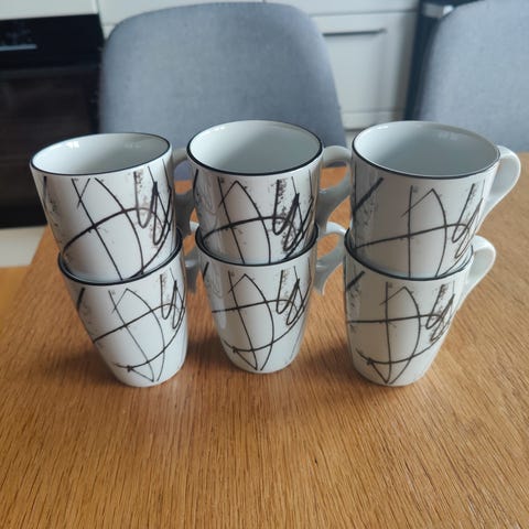 6 stk krus/kopper (se bilder). Koppene er pent brukt og selges samlet.