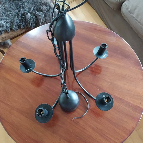 Grønn lysekrone med 5 lys. Høyde 50, diameter 55 cm. Selges uten pærer.
