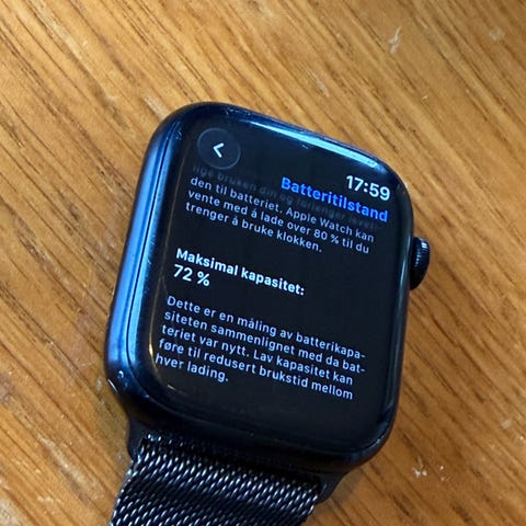 Jeg selger min nesten ikke brukt Apple Watch S9 45mm. Batterikapasiteten er på 100%. Ble kjøpt ny hos Eplehuset i 2024. Den har ingen riper.