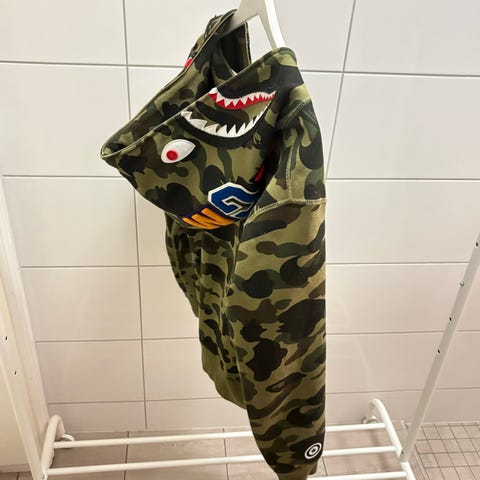 A BATHING APE hettegenser i størrelse S, fargen svart. Laget av bomullsmateriale. Genseren har hette med kamuflasjemønster og fargerike detaljer på ermer og hette. passer medium åsså