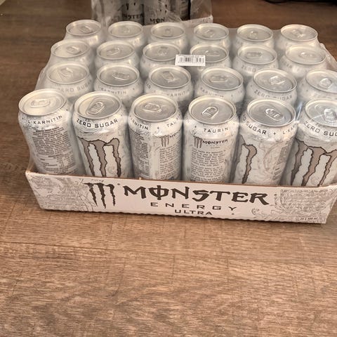 Monster Energidrikk kommer i en pakke med 24 bokser, hver med en volum på 0,5 liter. Monster original med sukker
