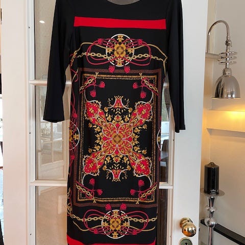 Joseph Ribkoff kjole i stretchy kvalitet. Jeg har klippet bort lappen, men den passer str. 36-38. Kun brukt et par ganger og er fin som ny.(74% polyamid, 18%polyester og 8% elastin)