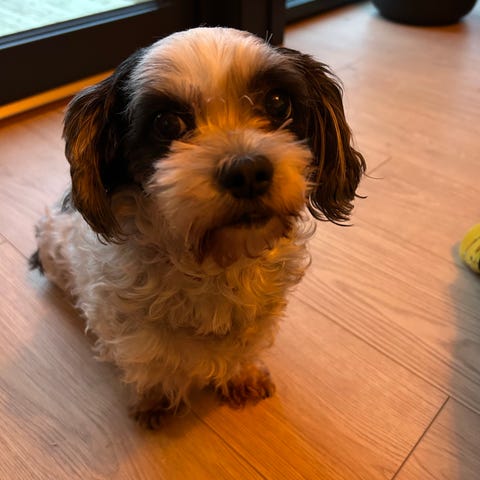 S är en blandning mellan pudel/terrier/cockapoo. Hon har fällfri päls, sinnet som en terrier, väger 5-6kg och är ca 35 cm hög.