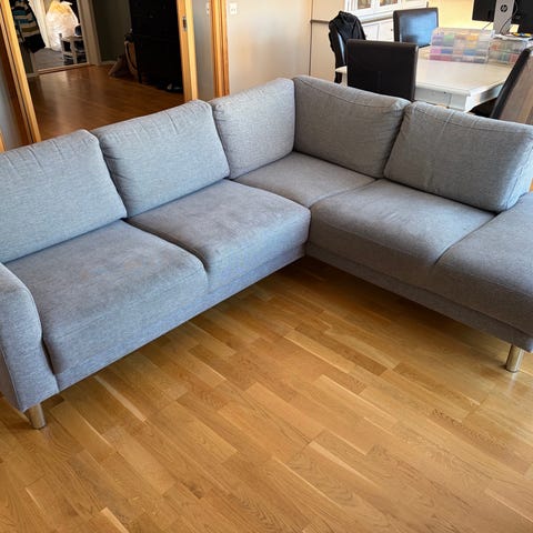 Perfekt i liten leilighet. Dette er en modulsofa, så 2 «klemmer» følger med for å feste sofaen sammen på undersiden (en hjørnemodul og en enkeltmodul). Den kan derfor monteres speilvendt fra bildet, om ønskelig.