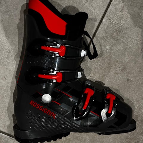 Rossignol skistøvler i størrelse 235/275 mm. Fargen er svart med rosa detaljer. Støvlene har fire spenner for justering og sikker passform.