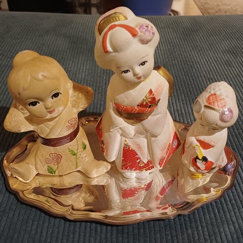 Dukken har forseggjorte, glitrende og fargerike klær. Den er i god vintage stand, har noe fargeslitasje på skoene. Den er ca 36 cm lang.