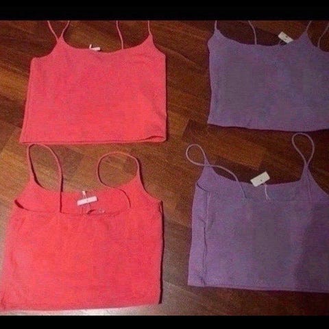 Forskjellige topper selges. Den lys lilla toppen og den hvite uten armer selges kr 50,- pr stk, resten 100 pr stk