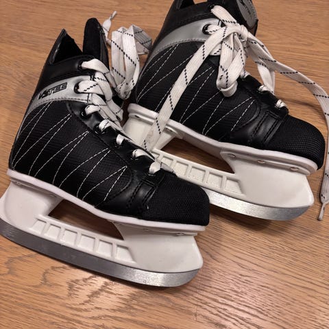 Ishockeyskøyter for barn. Skøytene har justerbar størrelse som dekker 27 til 30. Lite brukt, men noe slitt på meiene.