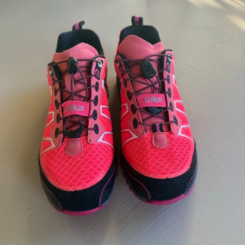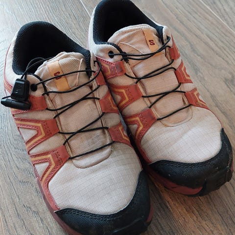 Salming Kobra for jente/dame i størrelse 38,5 (24,5 cm). Skoene har en kombinasjon av rød og gul farge med detaljer i lilla og blått. God støtte og grep, egnet for innendørs bruk.