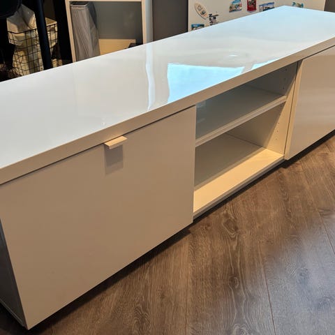 TV benk i hvit høyglans. Bredde cirka 160cm. Må hentes.