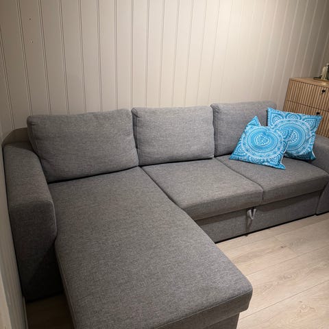 Grå toseter sofa i tekstil. Trekkene på rygg- og seteputer kan tas av og vaskes i vaskemaskin. Har blitt renset og vasket med jevne mellomrom.
