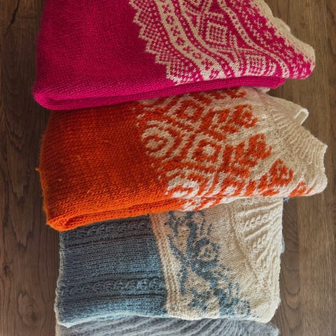 Genser en, strikket i innsving i livet og for litt mer byste, str L. Litt ekstra lengde i armer og lengde. Godt brukt, nupper, men mye genser igjen, brun og oker 300kr (myk kløfri ull husker ikke navn)