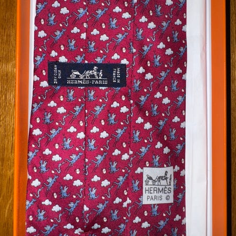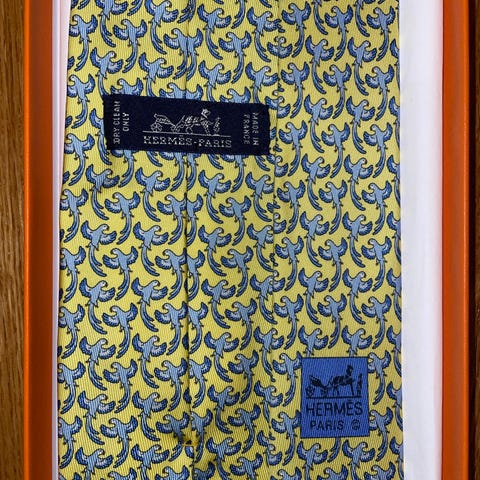 Blått Hermès slips med fisker. Lett misfarget i halsen, knapt synlig - se det siste bildet. Eske, snøre, konvolutt og pose kan følge med mot tillegg.
