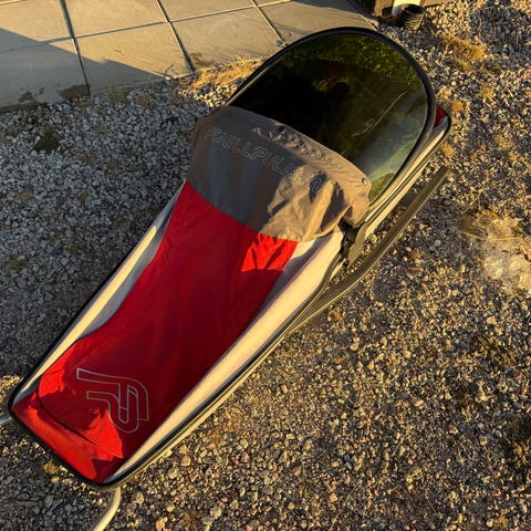 Fjellpulken Classic med inkludert drag, barnepose, fleecepose og beskyttelsetrekk.