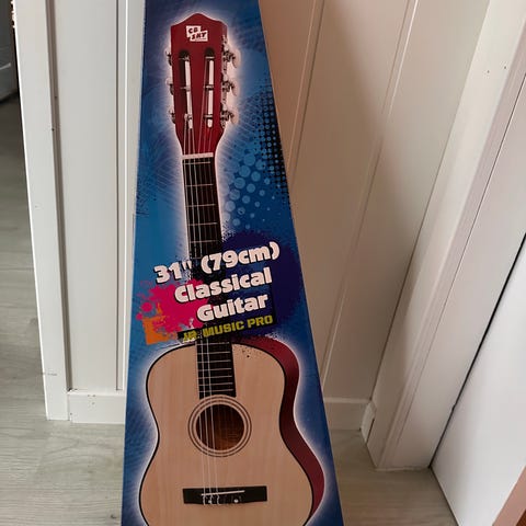 Watson akustisk gitar med tradisjonelt design. Gitaren har en klassisk kropp med seks strenger og stemmeskruer i hodet. Den egner seg for akustisk spilling og kan brukes av både nybegynnere og erfarne gitarister.
