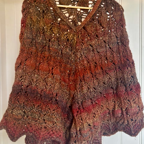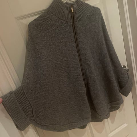 Massimo Dutti poncho i ullblanding (40% ull, 35% viskose, 15% polyamid, 5% kasjmir, 5% angora), størrelse M, farge grå. Laget i italiensk garn, designet for kvinner. Ponchoen har en strukturert strikk og en dekorativ lukking ved halsen. Litt stor i størrelsen.