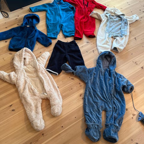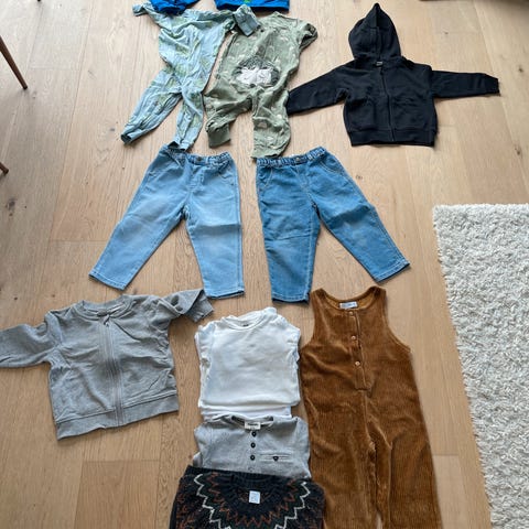 Stor klespakke i str. 92. Klærne er i god stand. Noen av plaggene er brukt mer enn andre. Det er et lite hull på ene bodyen, men det er helt nede ved kneppingen. Bilde er lagt ved.