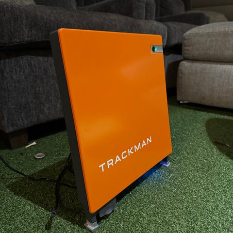 FlightScope Mevo+ Golf Launch Monitor i rød og hvit farge. En bærbar enhet designet for å analysere golfslag ved hjelp av avansert radar- og kamerateknologi. Inkluderer bæreveske og tilbehør for bruk og oppbevaring. Med powerbank og base platform for høyde og nivellering kostet ca25000