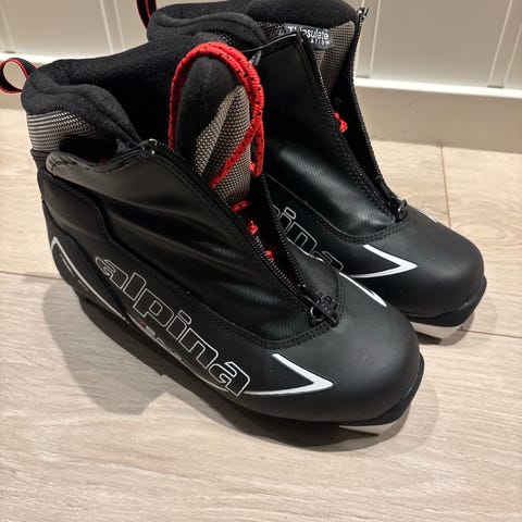 Alpina T5 Plus Touring Jr. langrennssko i størrelse 35. Skoene har en lukket glidelåslukking og er designet for langrenn. De har en solid og slitesterk konstruksjon og vi har vært veldig fornøyd med hvor varme og gode de er for våre barn.