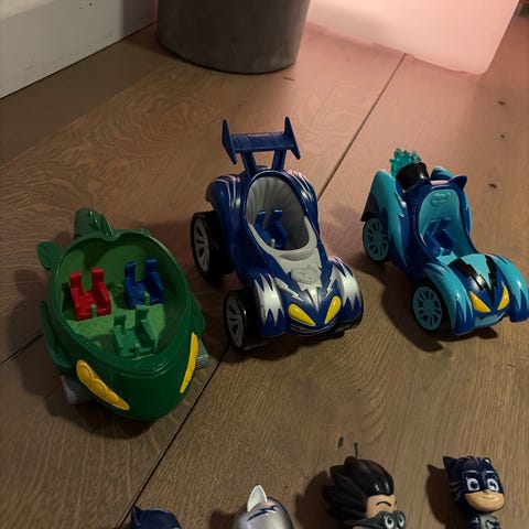 PJ Masks/pysjamasheltene lekesett med flere figurer og kjøretøy. Settet inkluderer karakterer og tilhørende små biler, egnet for barn som liker rollelek og eventyr.