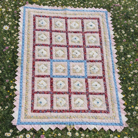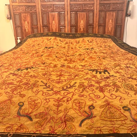 Teppet er quiltet, med lys bakside, og gir et lunt og dekorativt preg på sengen. Brukt, men i pen stand med normal patina og bruksspor som hører vintage til.