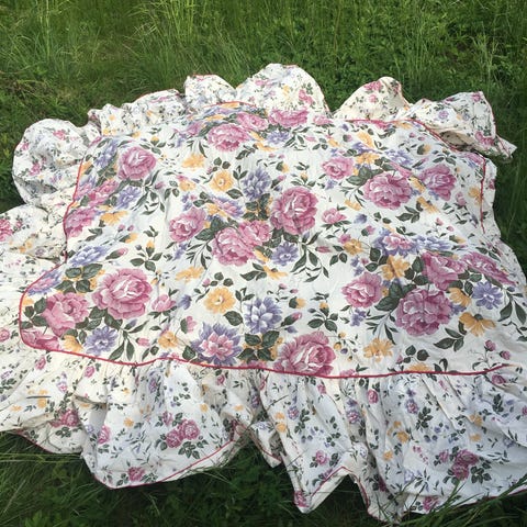 Vakkert vintage sengeteppe med stort blomster mønster i myke, varme farger. Klassisk uttrykk som passer perfekt til landlig stil, hytte eller romantisk soverom.
