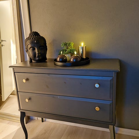 Selger en sort liten kommode med sorte kurver trukket i stoff. 2 store og 3 mindre. Usikker hvor den er kjøpt.