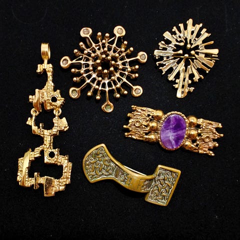Søkeord: Design norsk Norge finsk Finland bronse bronze smykke ring anheng brosje pin pins nål nålemerke kjede smykke smykker smykkelot smykkesamling halskjede ring retro vintage antikk antikt antikke samling samlergjenstander pynt gave Knut P. Juhl Juhls made in Finland Eivind Hillestad