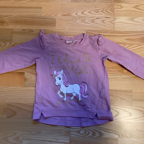 Rosa, myk genser med enhjørninger brodert i «paljetter». Str. 86/92, men oppleves noe stor i størrelsen. Fra merket Salto🌟 Brukt og vasket 1 gang.
