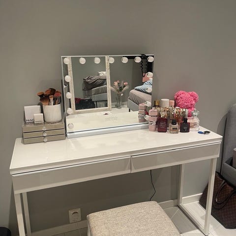 Kjøpt i 2025. Blitt brukt som sminkebord på soverom. Har hull og hylle til kabler.