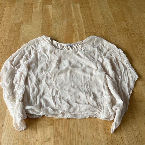 KAFFE bluse i størrelse 34 for dame. Blusen er hvit og laget av polyester. Den har knappelukking foran og et lett transparent mønster i stoffet. Brukt en gang