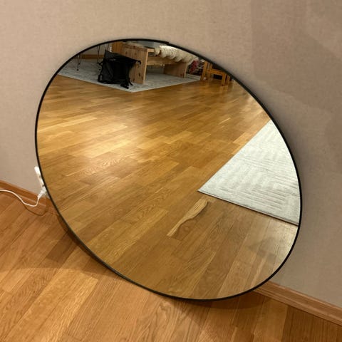 Rundt speil med gullramme