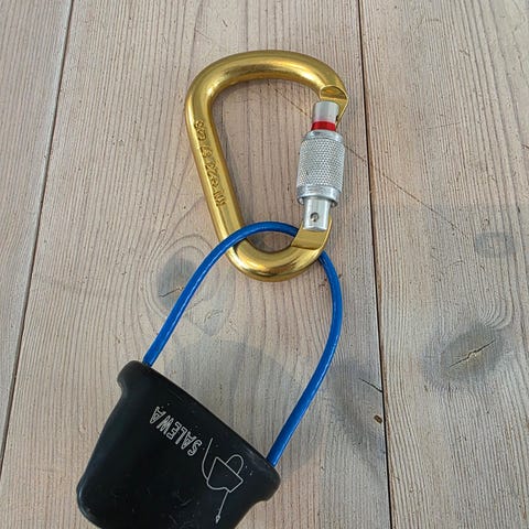 Karabinkrok med lås, laget av aluminum. Passer for festing og sikring av utstyr. Fargen er metallisk, sånn på bildet.