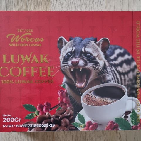 Kopi Merapi, en robusta-kaffe fra Merapi-området i Indonesia. Kaffen er malt, men ikke instant, og er ment for vanlig brygging hjemme, som filterkaffe eller presskanne.