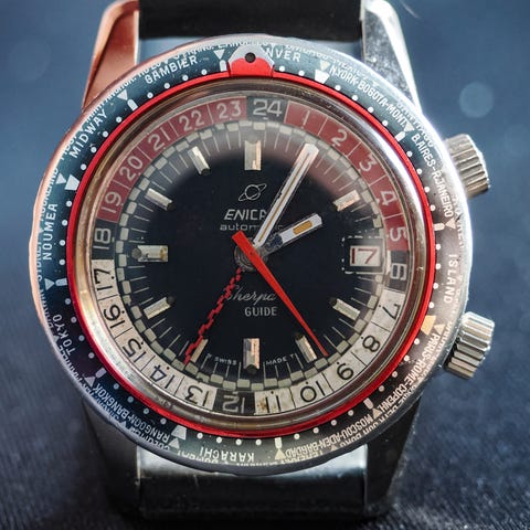 Eljo herreklokke med 1/2 times kronograffunksjon. Klokken har et rektangulært urhus i metall og svart urskive med to kronografunderskiver. Den er utstyrt med svart skinnrem med hvite sømmer. Klokken viser tid med analog visning og har pushere for kronografstyring. Måler 37,6 mm uten krone.