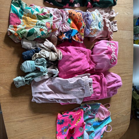 Klær for jente i størrelse 122/128. Inneholder flere plagg i rosa og andre farger, inkludert bukser, gensere, shorts, t-skjorter og kjoler i ulike materialer.