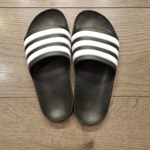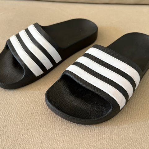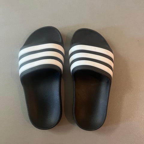 Adidas barnesandaler/slippers. Svarte med hvite striper. Ser ikke størrelse, men de måler rett i underkant av 18 cm så tipper de er 28-29. Kum brukt et par ganger.