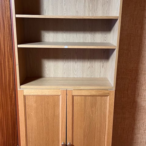 4 åpne hyller og 2 hyller i skapet.