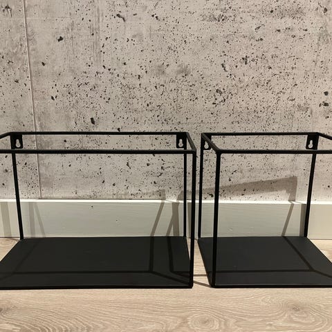 Selger en hylle med sort veggfeste og hylleplater i tre. Hyllene er 14 cm dype og 65 cm brede. Veggfestene er 67 cm fra øverste til nederste punkt.