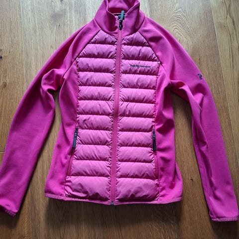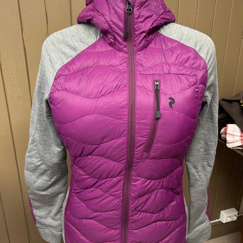 Peak Performance tynn dunjakke i størrelse M for kvinner. Jakken er knall rosa og laget med 90% dun og 10% fjær som materiale, egnet for utendørs bruk. Smal modell